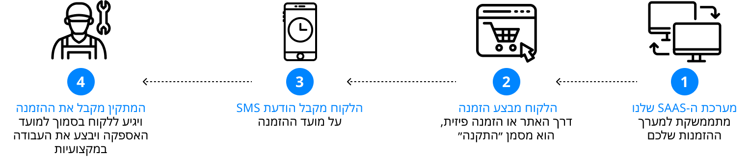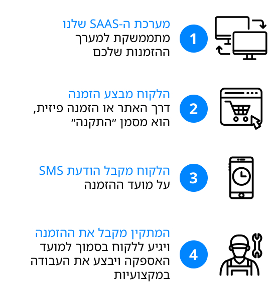 דרך מערכת ה- SAAS שלנו המתממשקת למערך ההזמנות שלכם. אנחנו מבצעים זאת בקלות על מנת לאפשר ללקוחות להזמין התקנה כבר במעמד הרכישה.
